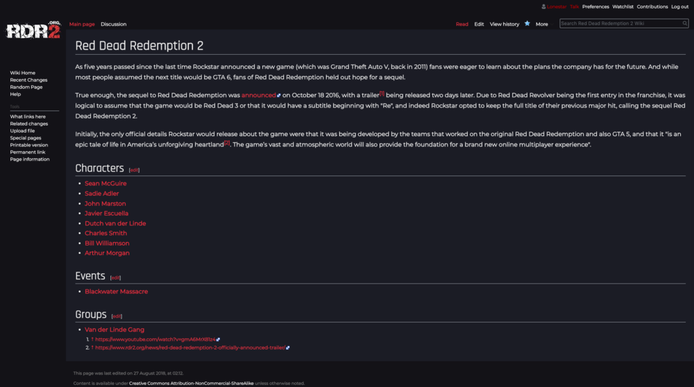 4. Hi everyone, the RDR2 Wiki is now open for business here https://www.rdr2.org/wiki/ We'd love to see the same community involvement in the wiki as we get in these forums (which as been fantastic)! So feel free to help out any way you want. It can be simply proof-reading articles, adding proper Wiki formatting (if required), add interlinking between wiki pages, or adding images all the way through to editing and expanding upon existing articles or creating entirely new ones about ANYTHING to do with the Red Dead Redemption universe. Just make sure you verify your email before you try to start editing anything. Please post here if you have any questions or comments and otherwise I look forward to seeing our wiki section expanding with lots of useful info Thanks! PS: If you are an experienced Wiki editor please get in touch with me via PM.