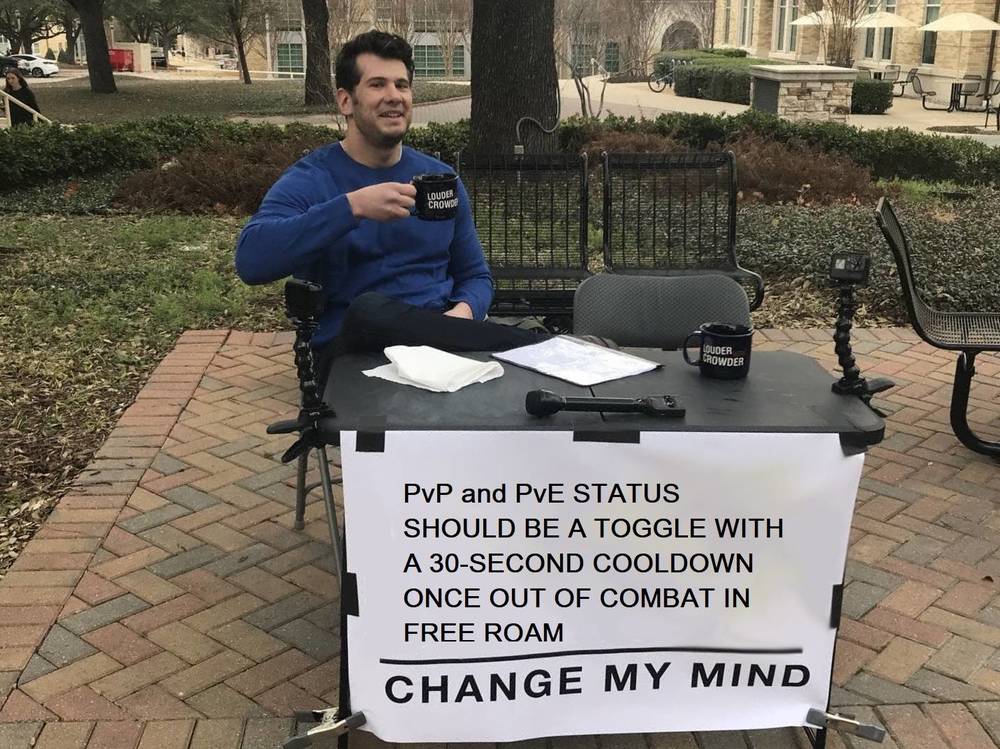Have everyone's default status set to PvE when it's rolled out. PvE players get what they want, and PvP players get the opportunity to activate at their leisure--which provides plenty of strategic opportunities if you think about it. That's not a logical argument. FFA players are already in the game with passive players--the passive players don't actively seek out PvP opportunities, so FFA players are simply looking to impose their will on players who want nothing to do with it. All you get now is the coercion of passive players into attempting to defend themselves (if they're even given the opportunity to do so). FFA players have no idea what a player's intentions are, so by having them toggled PvE, literally nothing changes, except for their ability to be ganged up on or shot in the back while off hunting/fishing/etc.... As long as there's no distinguishing feature or identifiers if a player is PvE or PvP, that element of FFA remains because you'll never know what to expect. Unless you're advocating for the ability to indiscriminately murder other players as you see fit, there's not a logical argument there. That's an argument for straight up PvP--calling it FFA is gilding the lily; just say you want PvP in Free Roam or dedicated servers. I'm trying to avoid having dedicated servers because once that road is traveled, there will be a push by the PvP community to have modifiers like increased XP gains, or nerfs to PvE servers because of the ability to farm or stat boost in peace. That's a dangerous precedent, and it creates a caste system within the game. Bigger posses that run amok on a server can rack up XP with impunity by harrying smaller or less well equipped posses/gangs. If that's what R* wants and intends, fine, but until they make a clear, definitive statement about their intentions, I wouldn't expect separate lobbies anytime soon. Loot tagging systems have been around forever. The simplest solution would be that if you "tag" a target by hitting it, any loot pulled from it is replicated and placed in your inventory if you're anywhere near it when it's looted. It actually would make more sense, in that a posse or group out hunting would have the benefit of not having to split loot or have everyone dismount and loot. If two groups or unallied players are chasing the same animal, whoever kills it with one shot DESERVES the loot. And locking looting behind the tagging system would prevent people from stealing someone else's loot. As for the fish thing? No system is perfect, but do you honestly expect full posses to roll up on lone fishermen and sit there tossing dynamite into a lake or stream? Trolling is going to exist no matter what they do, but mitigating things like spawn camping when players can't even defend themselves (like coming out of a cutscene) is WAAAAAAY different than ganking someone's fish or deer. A toggle addresses that. The argument for a separate lobby is all well and good, but I'd be wary about that because the same people accusing PvE players of "whining" are going to start whining themselves for extra XP or special status for paying in a PvP or FFA lobby instead of a PvE one; mark my words.2 points