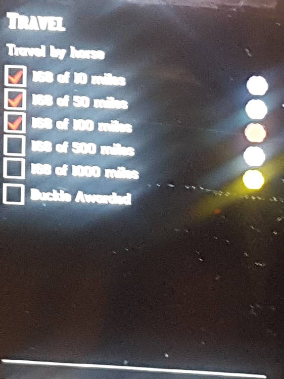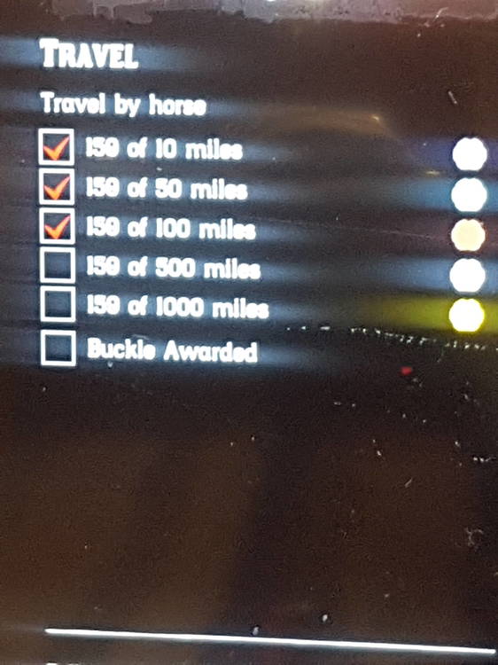 Ok so started up near brandywine drop just before 10am real time set my marker for sea of coronado i started with 159 miles traveled. I rode only using the trails, i arrived at 10:32am real time and finished with 168 miles traveled (so roughly 9 miles from one edge of the map to the other thats gotta be wrong) using real time it would take 50 hours of non stop riding at a avg to fast speed to get this award. To get the crime award for drag an enemy with a lasso it would take 5 hours of draging enemy's to get the 100miles and once again thats at a fast trot . Now if its 50 hours on horse back to get the 1000miles you could quite easily say to get 1000miles on foot would easily be double that (minimum) as horses easily travel at twice the speed if not more. .on top of that you need 100 miles in a canoe,1000miles by train ,100 miles in a coach,100 miles as a passenger on a coach. . .now awards aside as I'm guessing no one really cares to much about awards to say/class that distance as only 9 miles must be wrong and they need to fix there travel counter