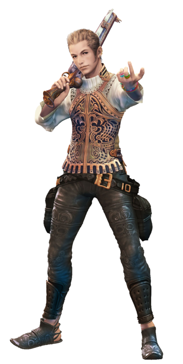Personality wise and demeanor would be like Batlhier from FF12 But will be like Paladin from "Have Gun Will Travel" when it comes to his over all morals So to use a D&D reference a chaotic good wanderer -