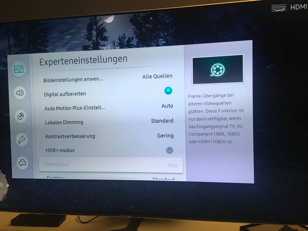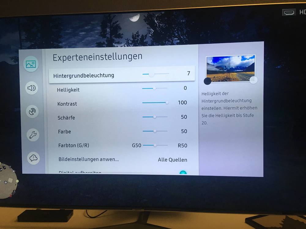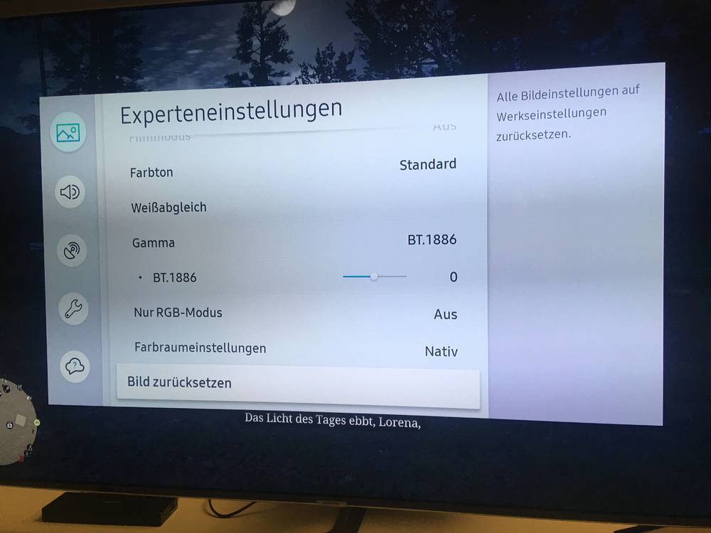 We put HDR on and 2160p in ps4 settings (was automatic before) and it became blurry. Then he put it to automatic again and made HDR off. Sharper again. Maybe his playstation buts it to 1080p automatically? It’s german btw. Helligkeit - brightness Kontrast - contrast Schärfe - sharpness Farbe - color/colour Digital aufbereiten - digital editing Lokales dimmen - local dimming Hope that helps