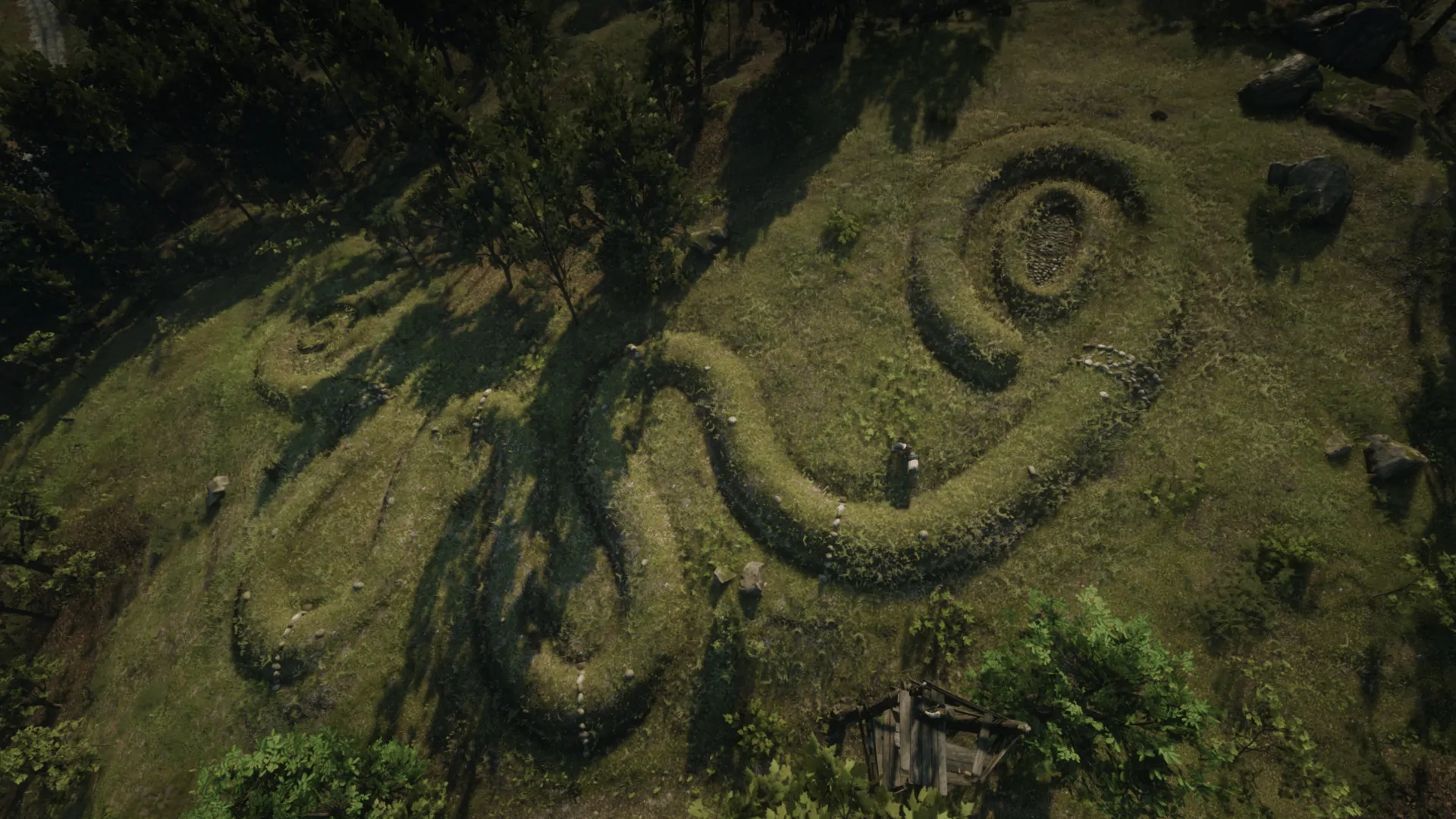 The Serpent Mound can be found to the southwest of the Van Horn trading post. Get on the road leading south of the trading post, proceed west past the fork in the road leading to the Manmade Mutant and look to the south to find a wooden tower. Climb on top of it to spot the Serpent Mound.