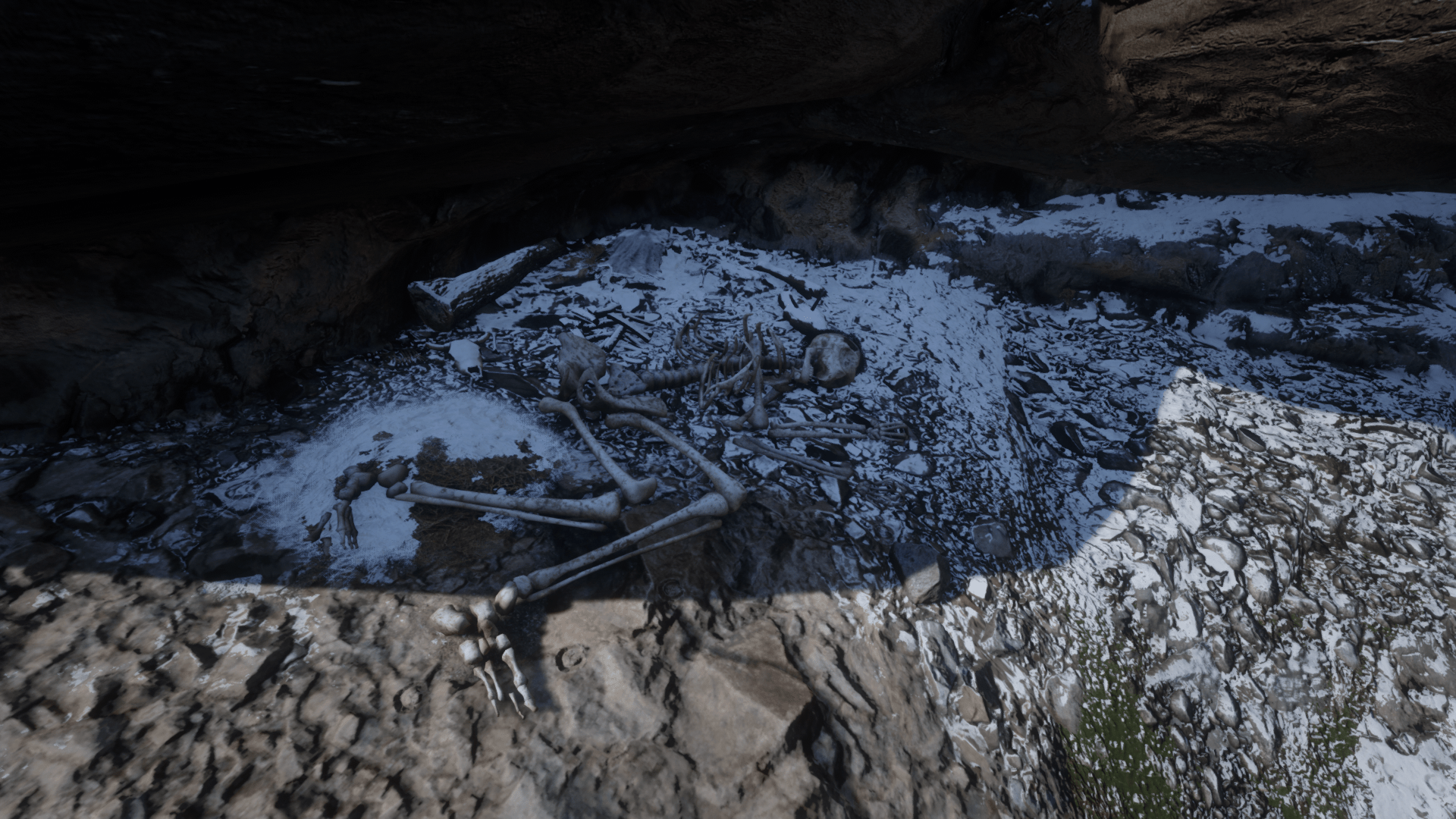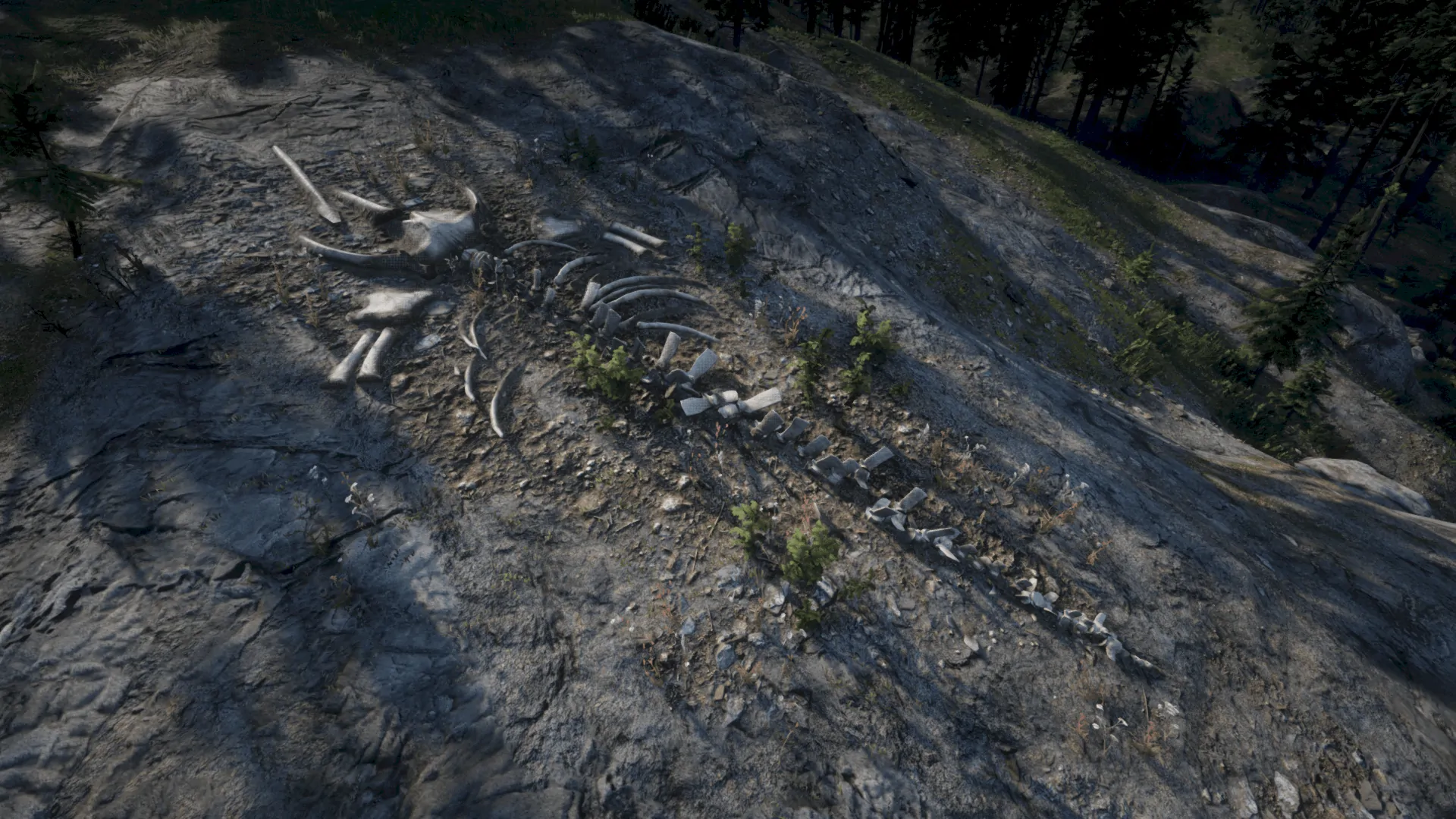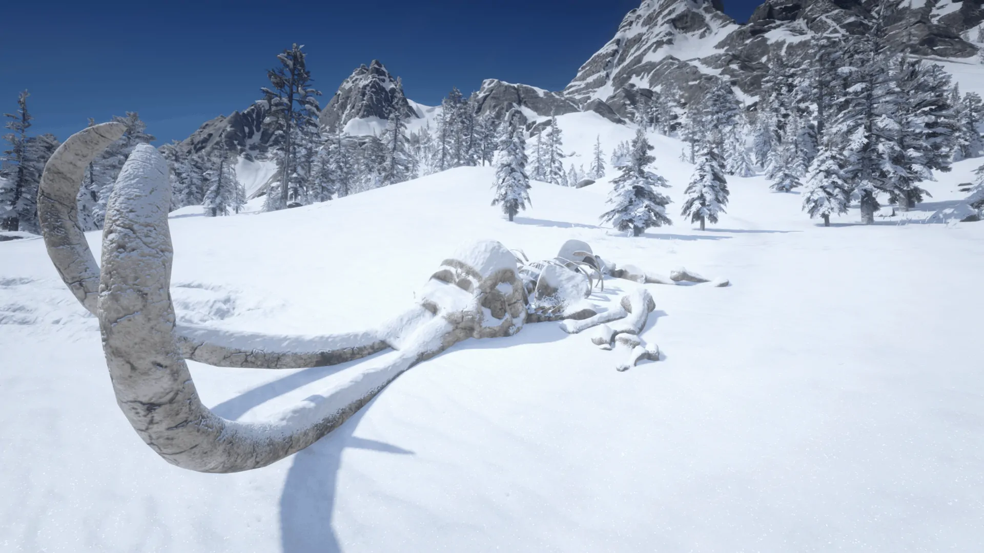 The Mammoth point of interest can be found near the Deadboot Creek and Spider Gorge rivers meet, to the northwest of the “M” in Ambarino on the map. Lying in the snow, you will find the remains of a mammoth.