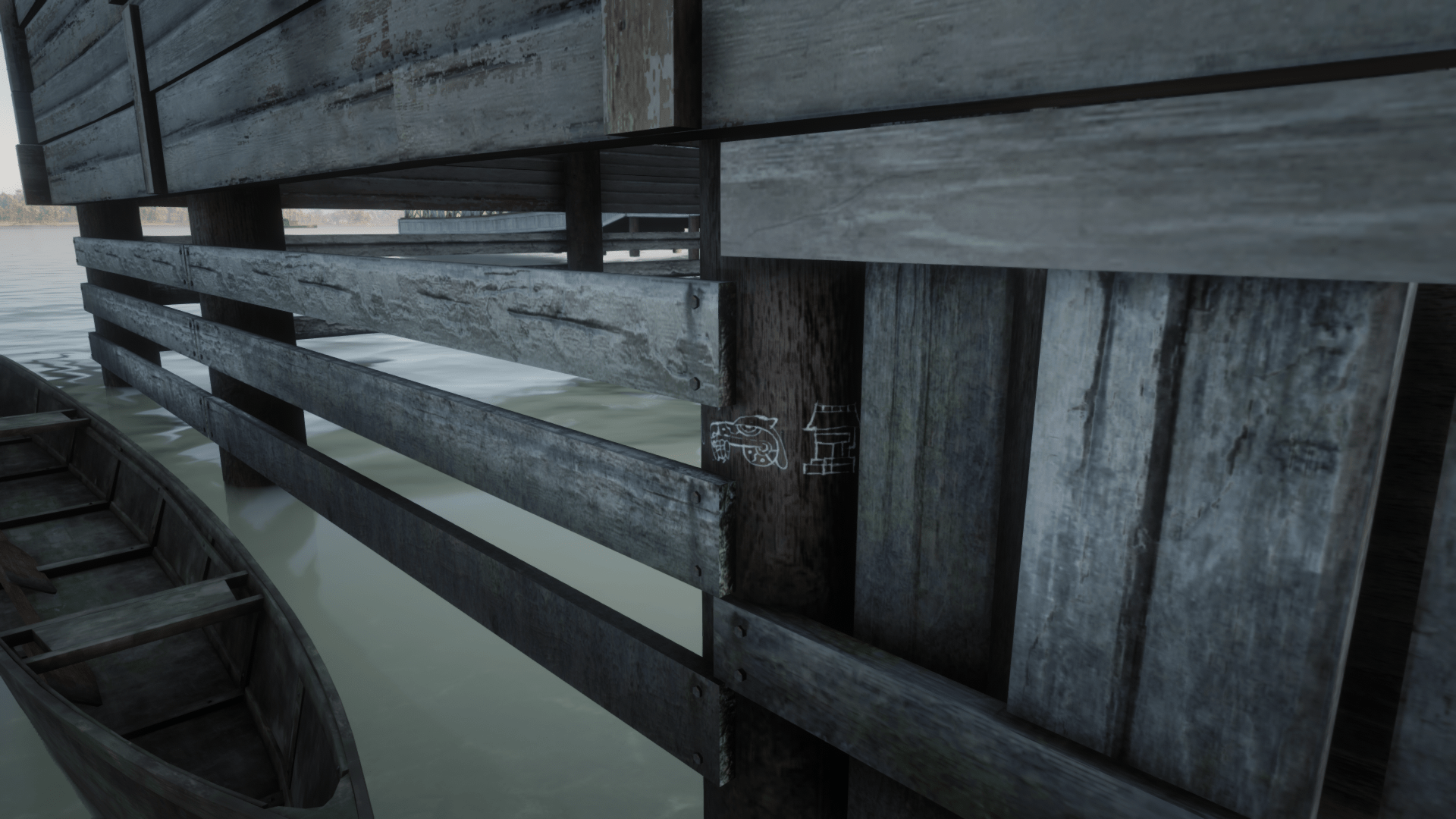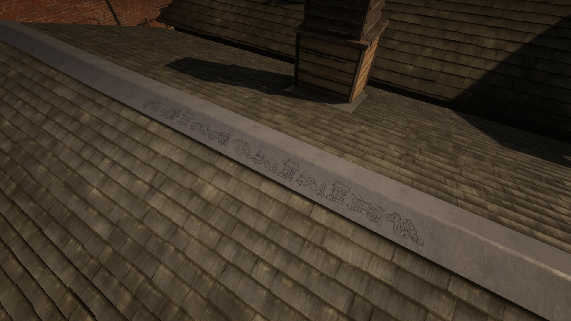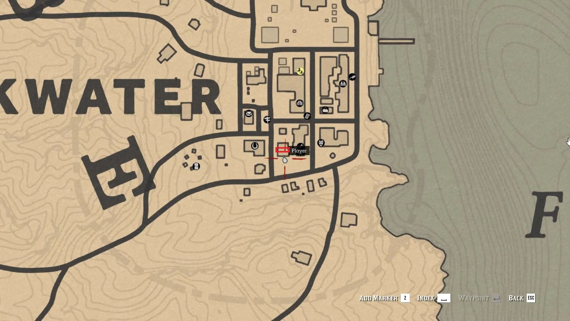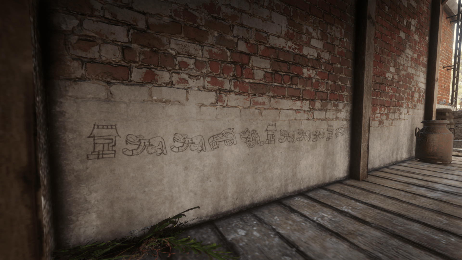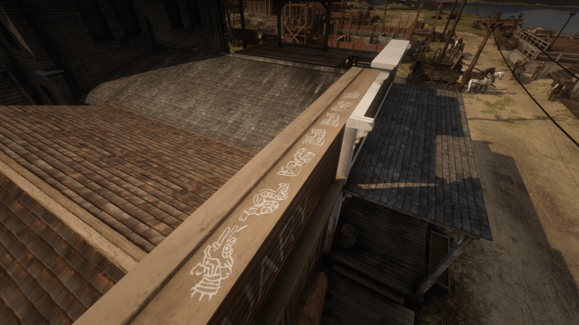 Inside the city of Blackwater are six Aztec Symbols which are actually an Easter Egg that make a reference to the Undead Nightmare of the original Red Dead Redemption. The first writing located in the passthrough tunnel off Main Street between the Blackwater Saloon and Mrs. Wilson’s sweet shop, on the roof of the Grain & Feed building across from the post office, in a dead-end alleyway in the south-east corner of town and on a pylon on the north side of Blackwater Pier.