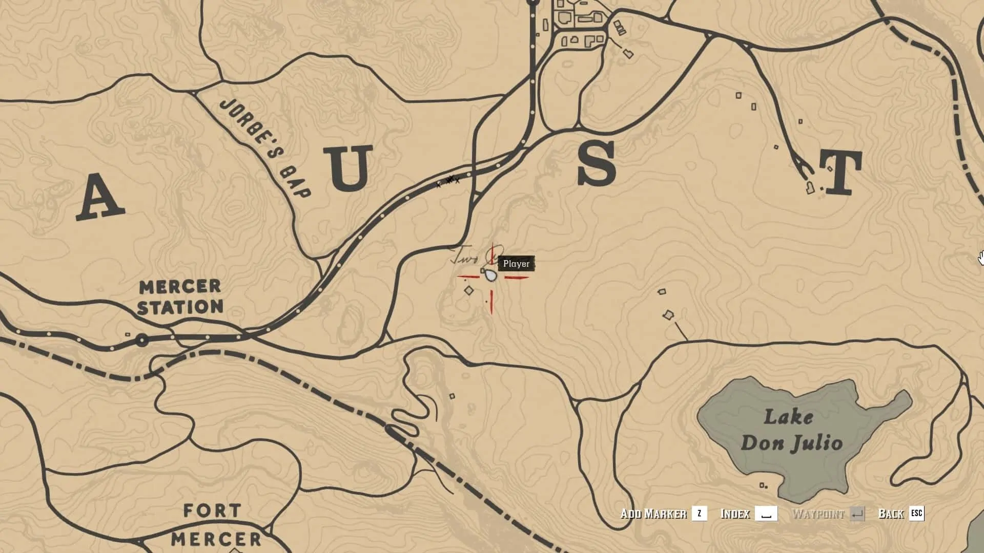 The Donkey Lady can be found a little to the south of the gap between the “U” and “S” in New Austin on the map, on the same height as Mercer Station. The woman can be found inside Two Crows village leaning against an old well.