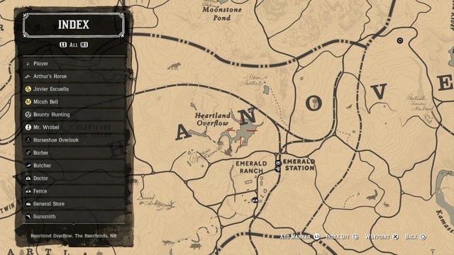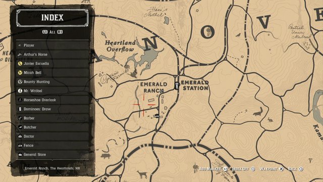 Emerald Ranch is a location in The Heartlands, New Hannover. There you can find three collectible cigarette cards and is also the location of the first fence.
